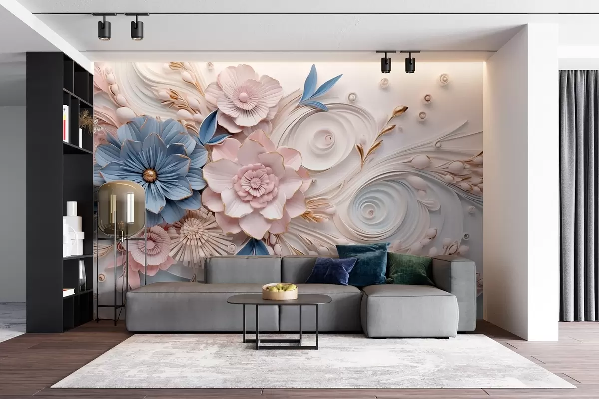Fototapeta Delikatna kompozycja kwiatowa w odcieniach różu i błękitu z miękkim reliefowym tłem Nr w08847