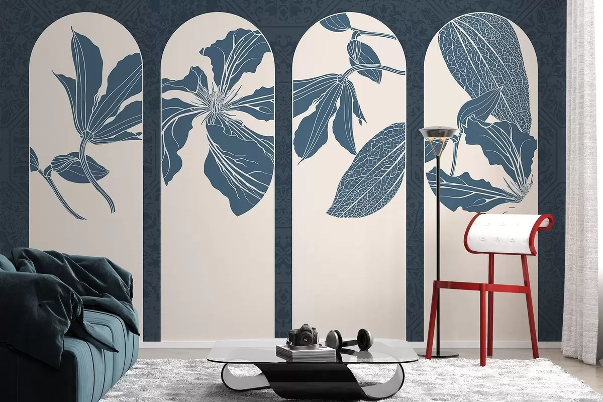 Fototapeta Eleganckie łuki z kwiatowymi wzorami w kolorze ciemnoniebieskim i białym, na teksturowanym beżowym tle, minimalistyczny styl Nr w08866v1