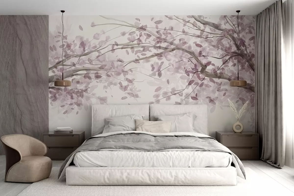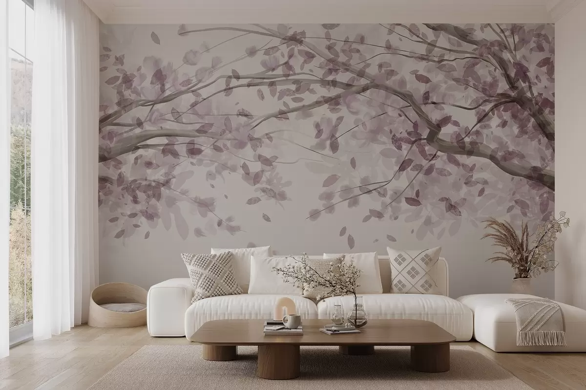 Fototapeta Gałązki kwiatów z różowymi liśćmi, miękkie kolory, delikatne detale, styl akwareli, na jasnym tle Nr w08867