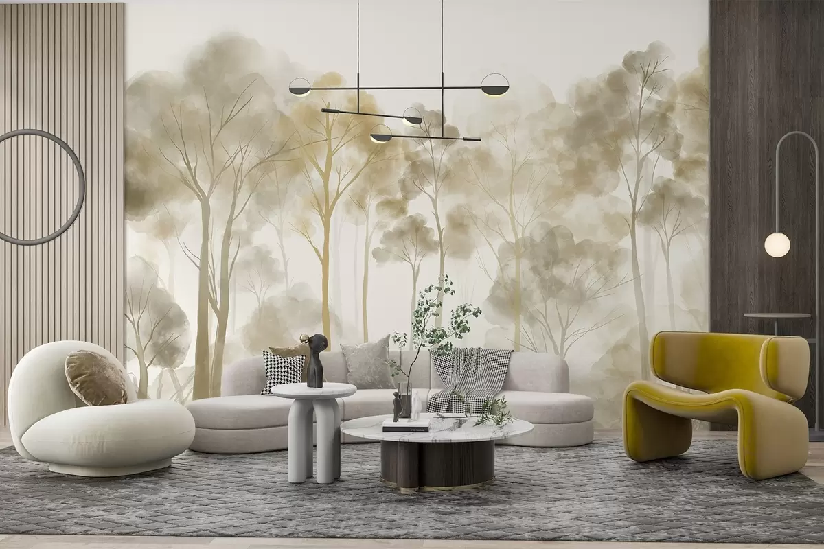 Fototapeta Las w stylu akwareli z wysokimi jasnymi drzewami w odcieniach beżu i żółci, z mglistą atmosferą Nr w08870
