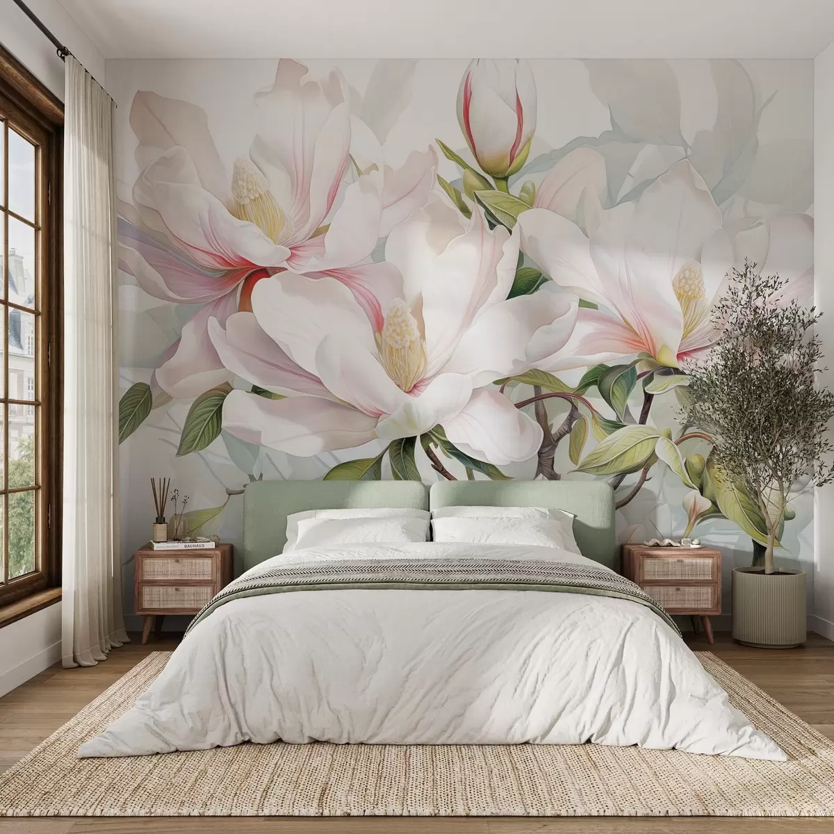 Fototapeta Kwiaty magnolii z białymi i różowymi płatkami, liśćmi i brązowymi gałązkami, miękki i delikatny styl akwareli Nr w08885