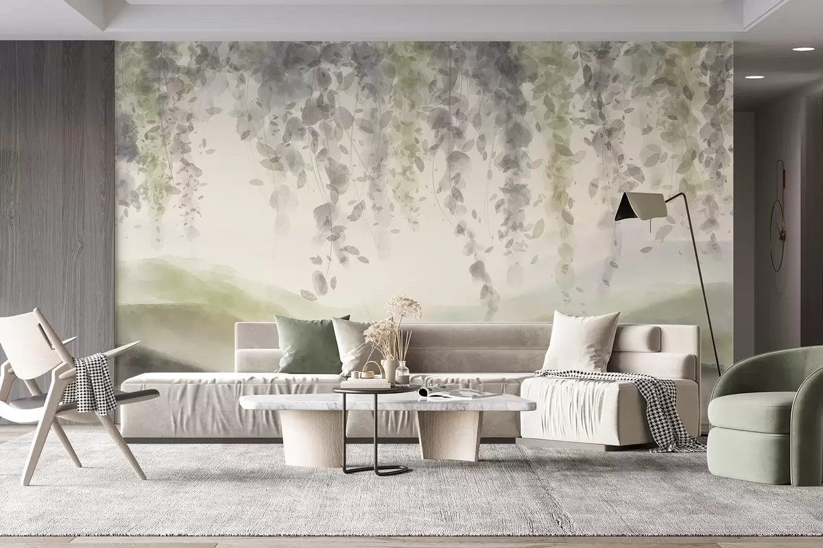 Fototapeta Liście glicynii wiszące nad górami, miękkie pastelowe kolory zieleni i beżu, pejzaż w stylu akwareli Nr w08909v2