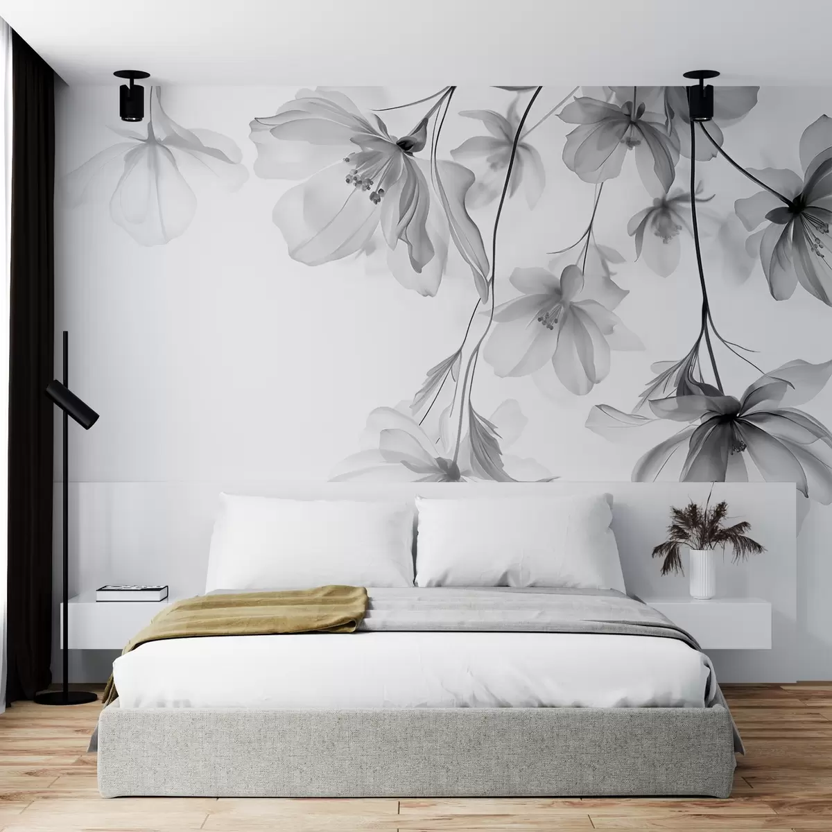 Fototapeta Czarne kwiaty z półprzezroczystymi płatkami zwisającymi z gałęzi, czarno-biała, minimalistyczna kompozycja sztuki nowoczesnej Nr w08911
