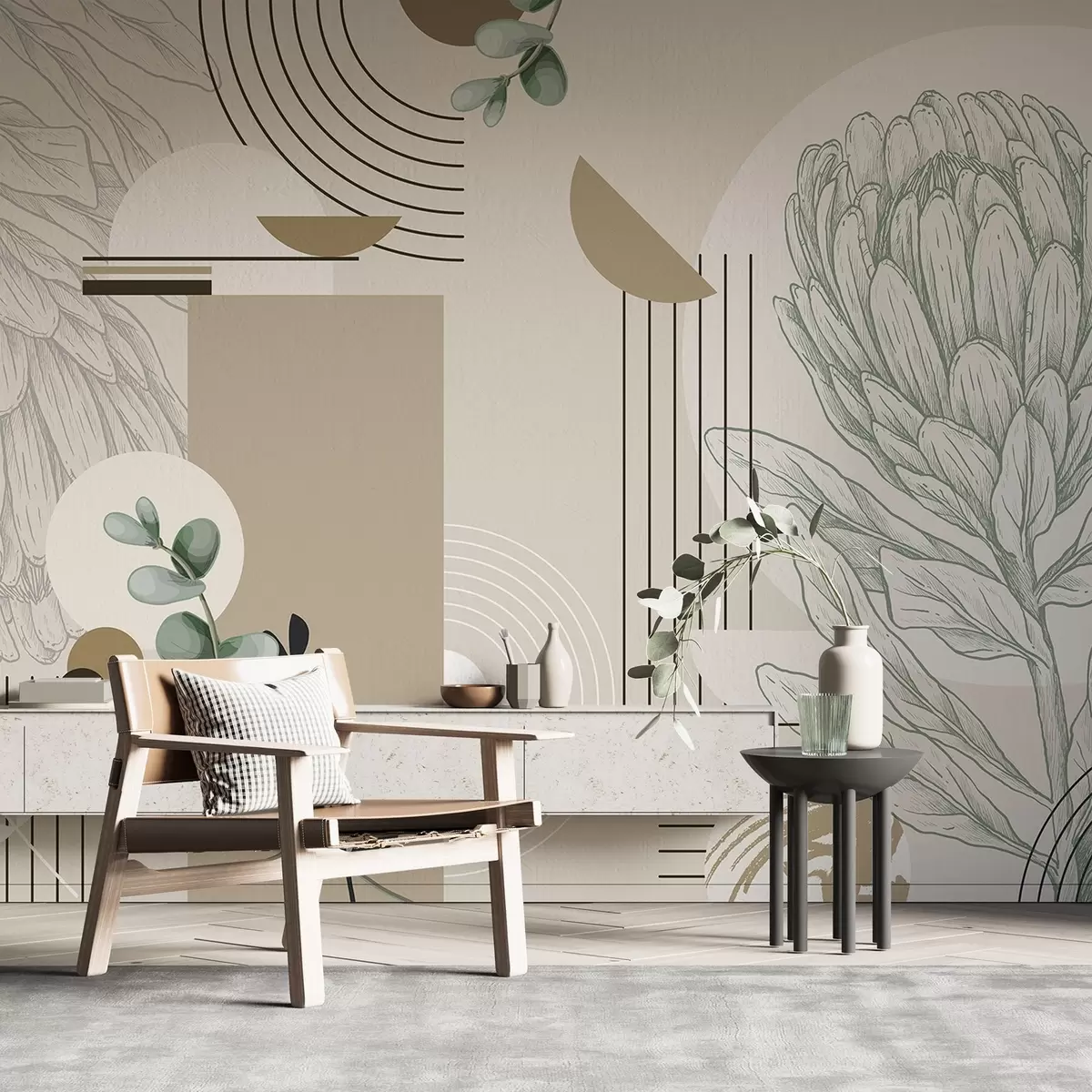 Fototapeta Abstrakcyjny nadruk botaniczny z kwiatem protei, liśćmi eukaliptusa, geometrycznymi kształtami w minimalistycznym stylu, pastelowe kolory Nr w08914