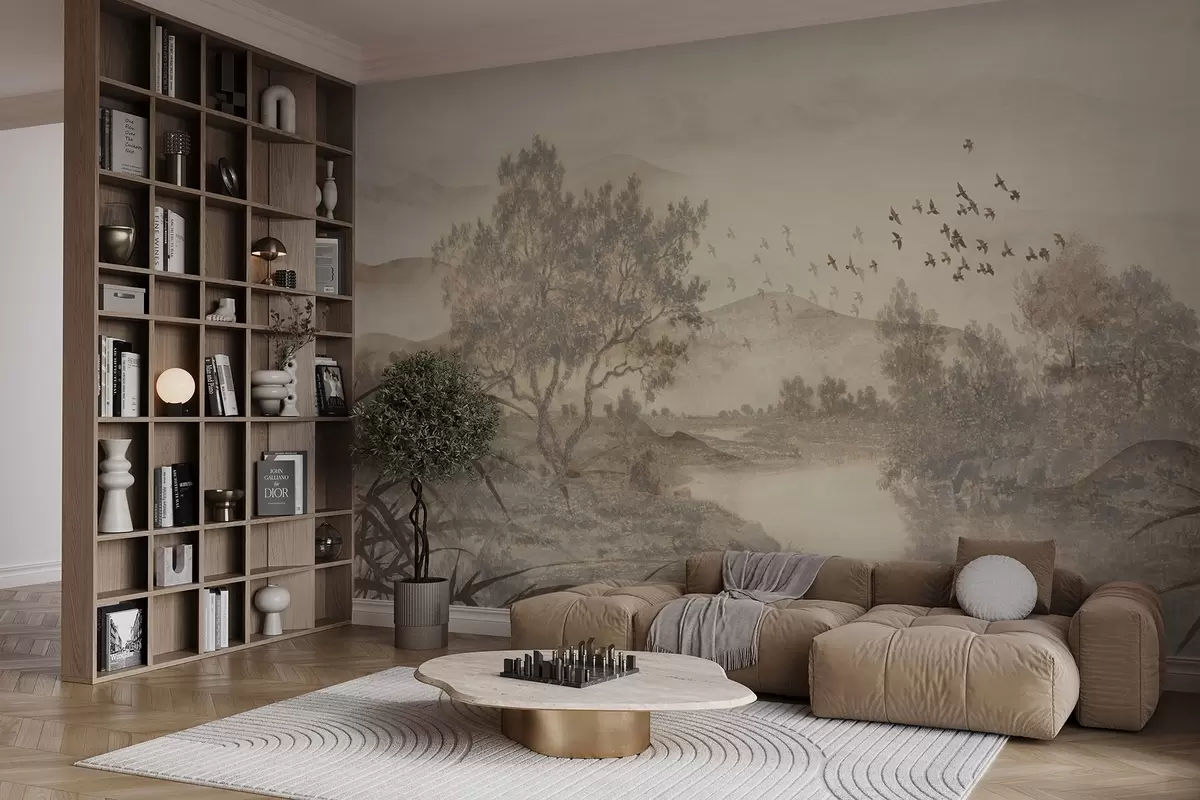 Fototapeta Teksturowany krajobraz w stylu vintage z drzewem w pobliżu rzeki i zachmurzonym niebem, sztuka natury w odcieniach sepii Nr w08920