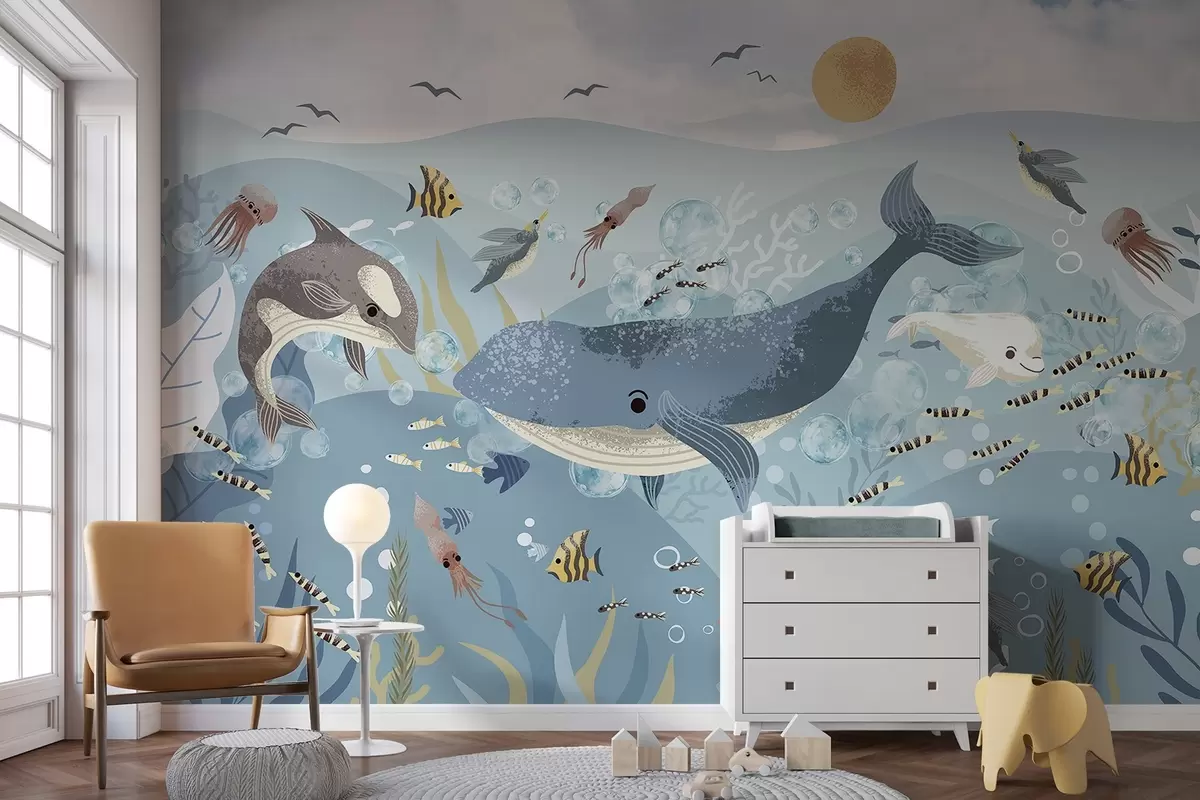 Fototapeta Ilustracja dla dzieci z niebieskim wielorybem otoczonym rybami, kałamarnicami, meduzami w błękitnym oceanie z bąbelkami Nr w08921