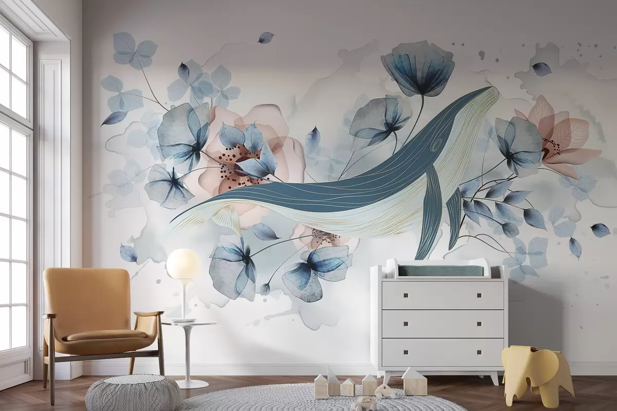 Fototapeta Niebieski wieloryb z kwiatami, styl akwareli, jasnoniebieskie i różowe kolory, jasne tło Nr w08922