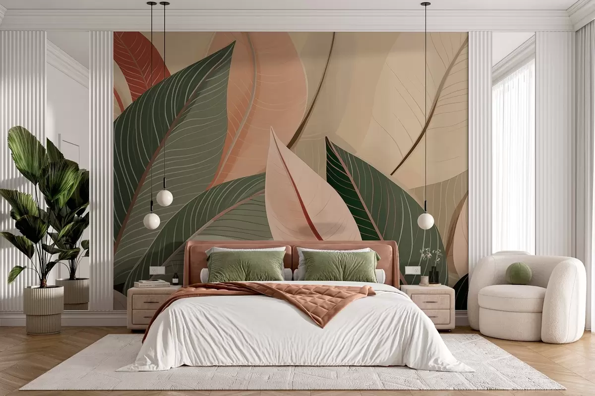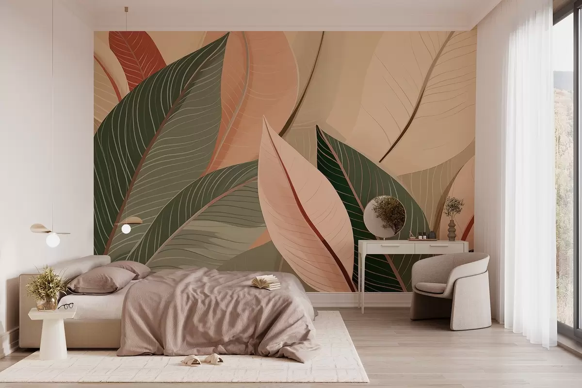 Fototapeta Zbliżenie liści w kolorach oliwkowej zieleni i różowo-kremowym Nr w08944
