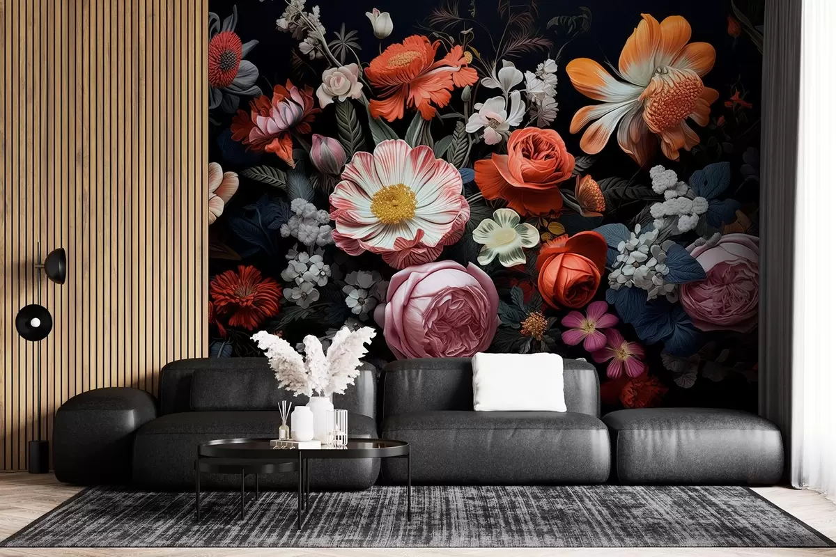 Fototapeta Kolorowy bukiet różnych kwiatów na ciemnym tle w chłodnych odcieniach Nr w08969v1