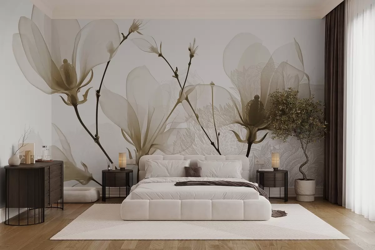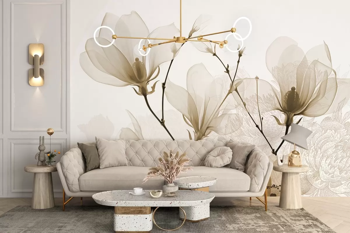 Fototapeta Przezroczyste beżowe kwiaty magnolii z sylwetkami kwiatów o delikatnych płatkach i ciemnych łodygach Nr w08978v1