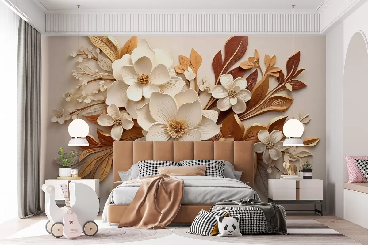 Fototapeta kwiaty 3D z liśćmi w stylu origami w odcieniach beżu Nr w08984