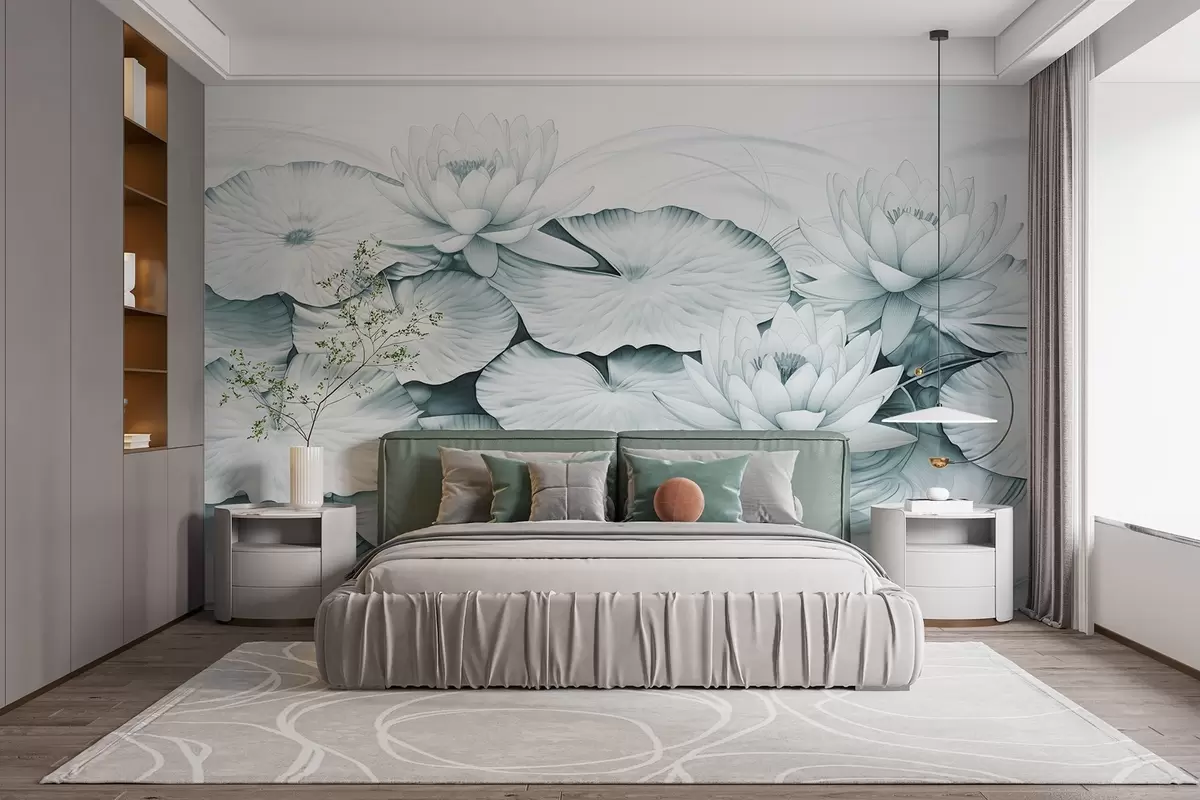 Fototapeta Lilie wodne i płatki lilii w stawie, turkusowa i biała imitacja rysunku ołówkiem, szczegółowa ilustracja botaniczna, sztuka natury Nr w09006v1