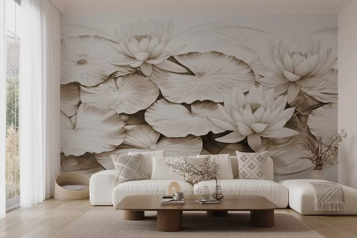 Fototapeta Lilie wodne i płatki lilii w stawie, brązowo-biała imitacja rysunku ołówkiem, szczegółowa ilustracja botaniczna, sztuka natury Nr w09006v2