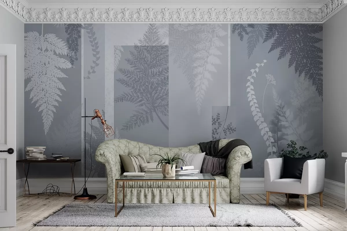 Fototapeta Liście paproci w kolorze niebieskim i białym, ułożone w pionowe paski, tworząc botaniczny i minimalistyczny nadruk, w delikatnych i stonowanych kolorach Nr w09007v1