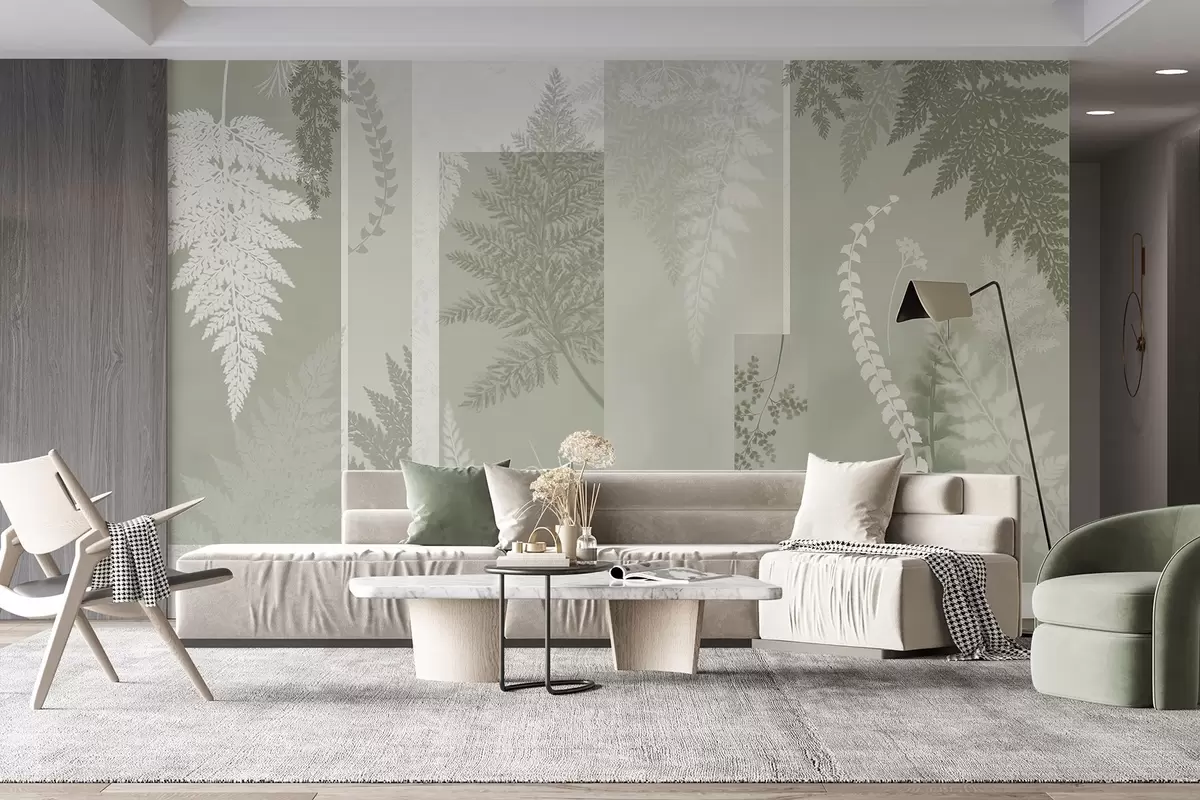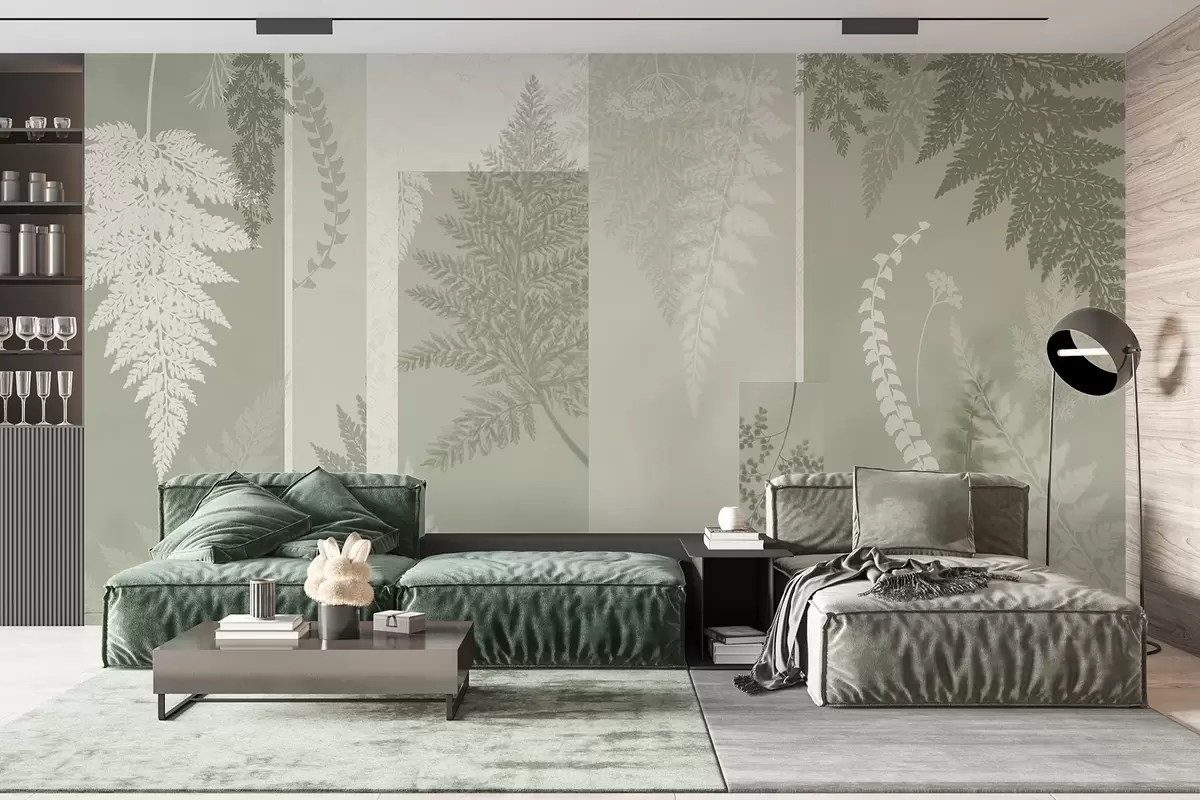 Fototapeta Liście paproci w kolorze zielonym i białym, ułożone w pionowe paski, tworząc botaniczny i minimalistyczny nadruk, w delikatnych i stonowanych kolorach Nr w09007v2