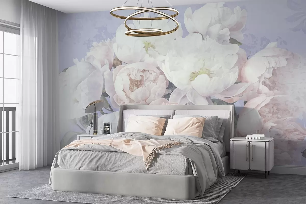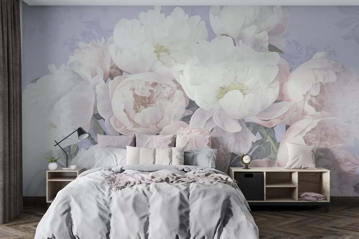 Fototapeta Teksturowane abstrakcyjne brzoskwinie i białe piwonie z zielonymi liśćmi, jasne tło, miękkie i delikatne kolory, styl vintage Nr w09008v1