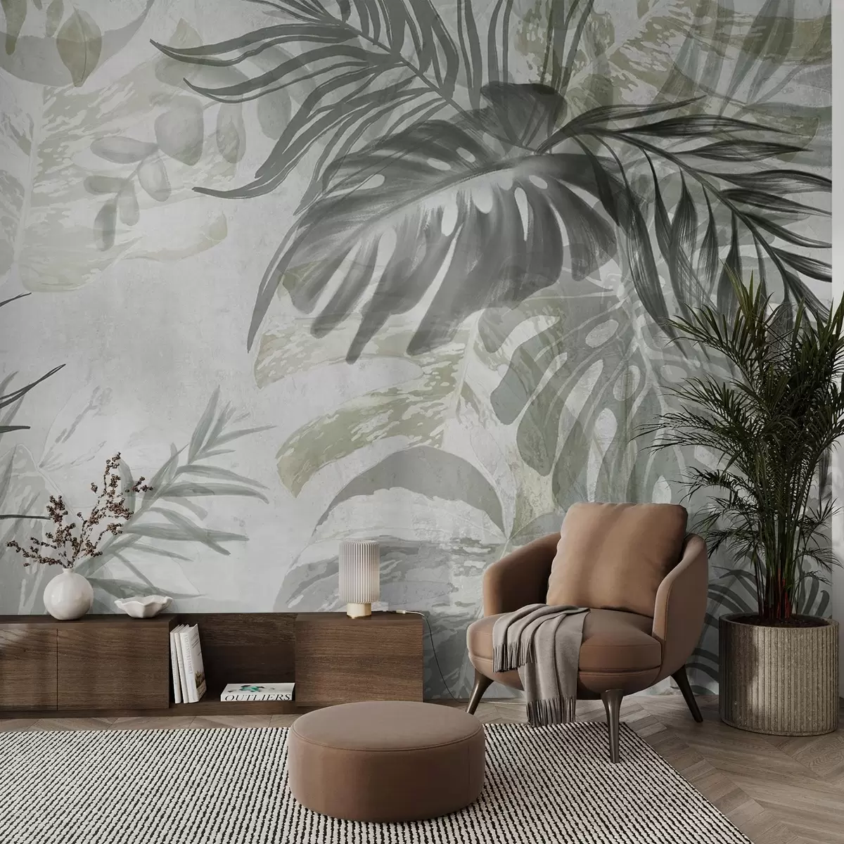 Fototapeta Monstera i liście palmy w odcieniach zieleni i szarości, botaniczne, tropikalne liście, rośliny dżungli, teksturowane tło Nr w09011