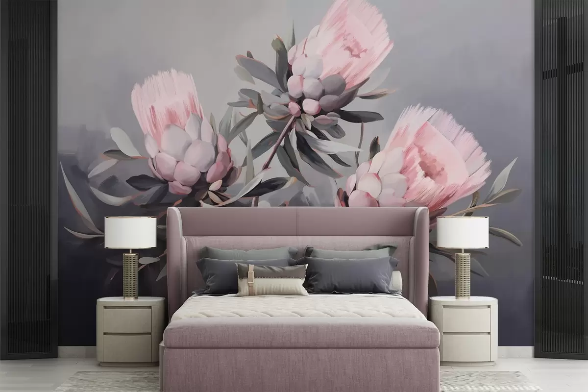 Fototapeta Różowa protea abstrakcyjne kwiaty z szarymi liśćmi, miękkie teksturowane pociągnięcia pędzla, stonowane kolory, na rozmytym szarym tle Nr w09014