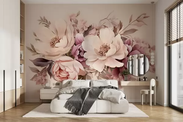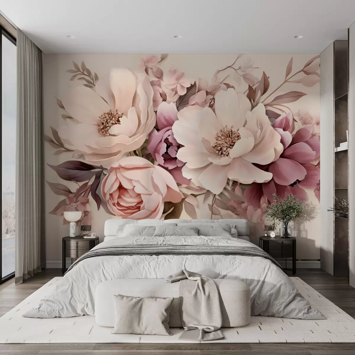 Fototapeta Delikatna kompozycja różowych i beżowych kwiatów, piwonii z liśćmi Nr w09019