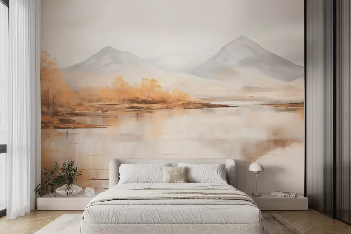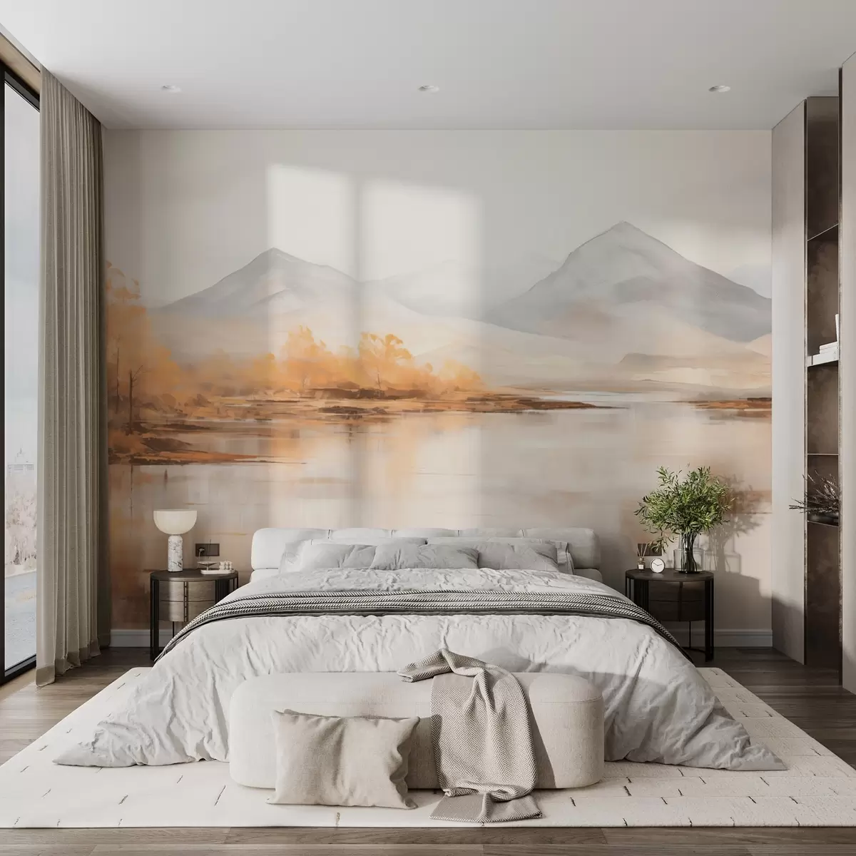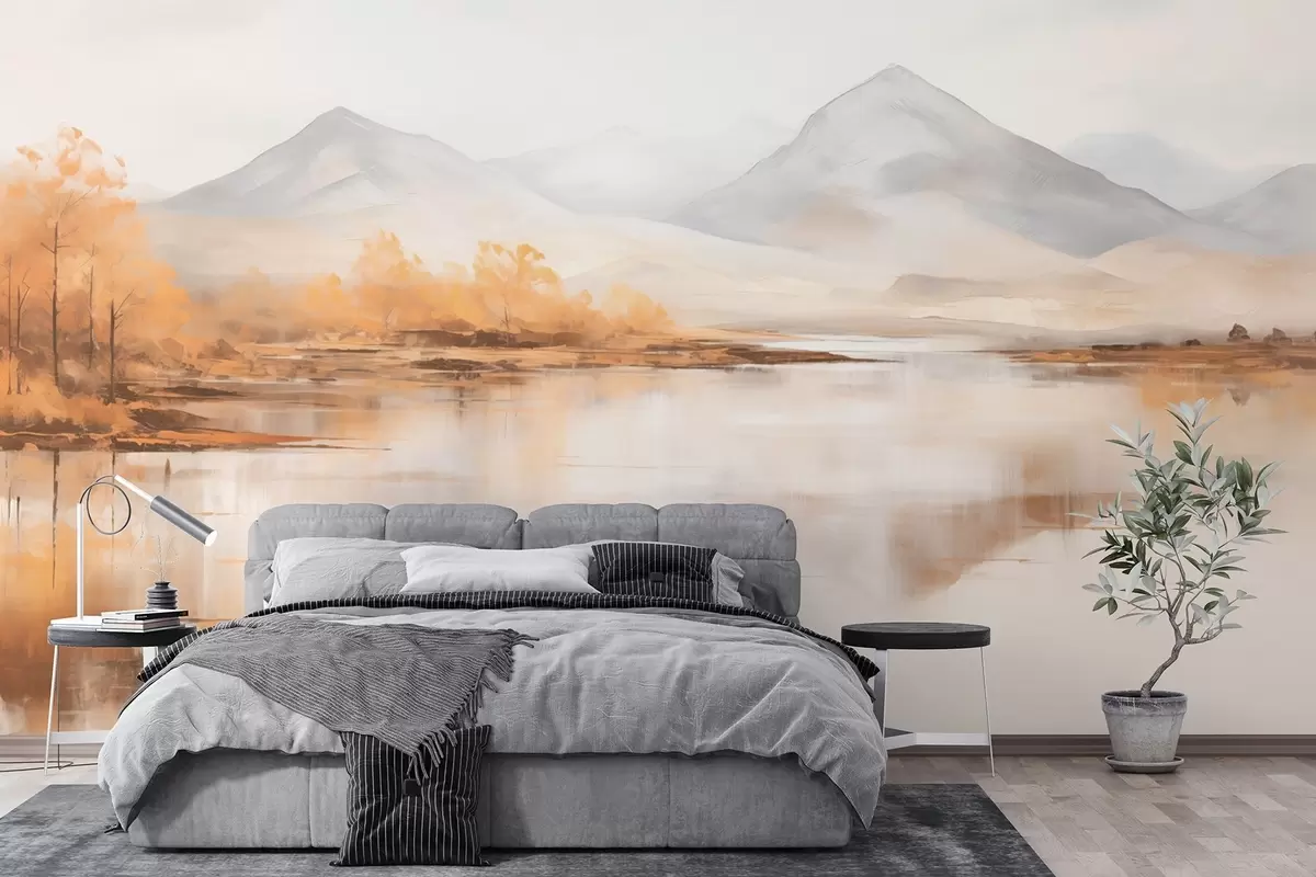 Fototapeta Jesienny krajobraz z żółtymi drzewami i rzeką na tle gór Nr w09020