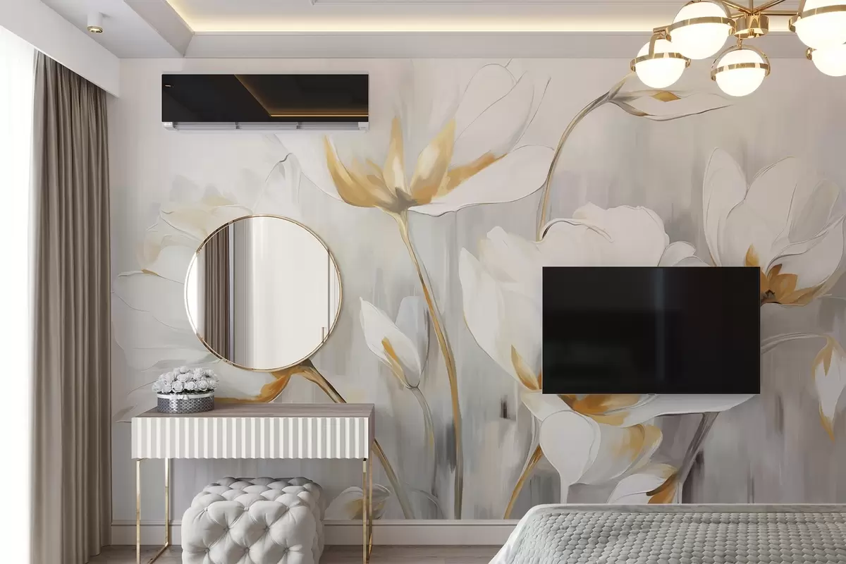 Fototapeta Białe abstrakcyjne kwiaty z białymi płatkami i łodygami na szarym tle z szarymi i białymi pionowymi pociągnięciami pędzla Nr w09047