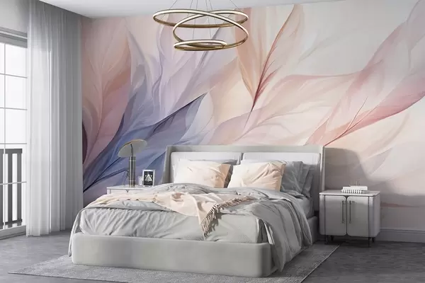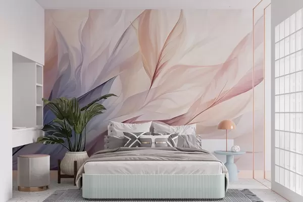 Fototapeta Abstrakcyjny kwiatowy wzór z płynącymi płatkami w pastelowych odcieniach różu, brzoskwini i błękitu, tworząc miękką i marzycielską kompozycję Nr w09049