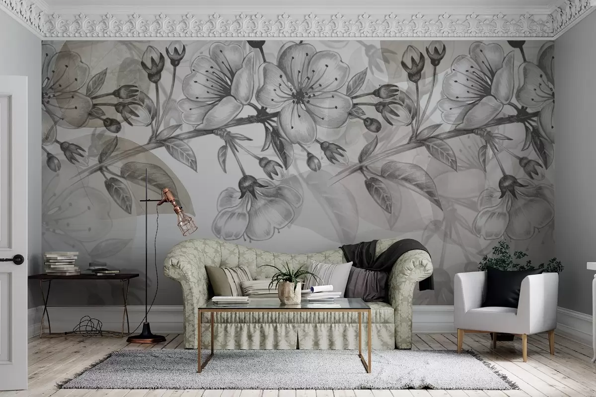 Fototapeta Gałąź kwitnącej wiśni z kwiatami i pąkami, odcienie sepii, miękkie akwarelowe tło z szarymi i brązowymi odcieniami Nr w09051v1
