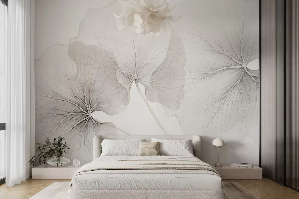 Fototapeta Trzy półprzezroczyste liście z widocznymi żyłkami, z lekko zachodzącą na siebie teksturą szumu, z cienkimi łodygami na białym tle Nr w09052