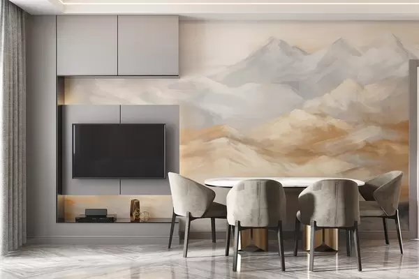 Fototapeta Teksturowany pejzaż przedstawiający góry z jeziorem na pierwszym planie, w odcieniach bieli, szarości i brązu Nr w09057