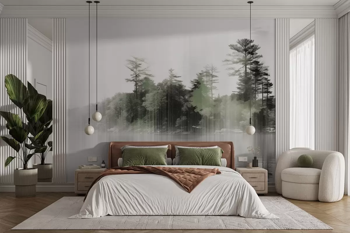 Fototapeta Abstrakcyjny minimalistyczny teksturowany krajobraz z jeziorem i odbiciami drzew w wodzie w odcieniach zieleni i bieli Nr w09058