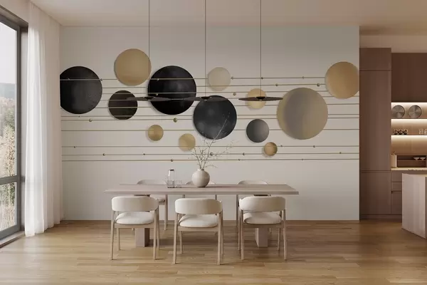 Fototapeta Abstrakcyjny nowoczesny design z teksturowanymi okręgami w odcieniach bieli, żółci i szarości, połączonymi cienkimi liniami, minimalistyczna sztuka Nr w09060