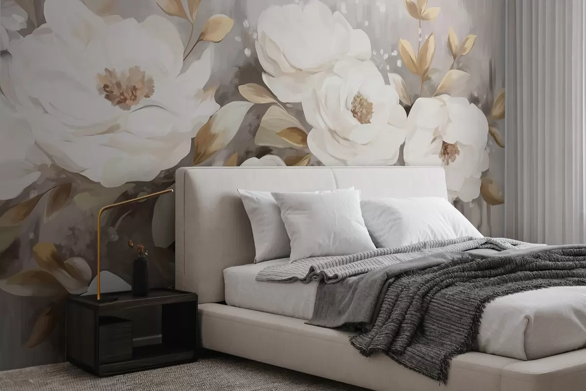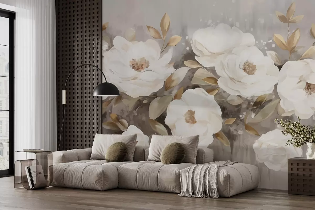 Fototapeta Białe kwiaty z żółtymi liśćmi, miękkie płatki, delikatna kompozycja kwiatowa, neutralna paleta kolorów, teksturowane pociągnięcia pędzla Nr w09062