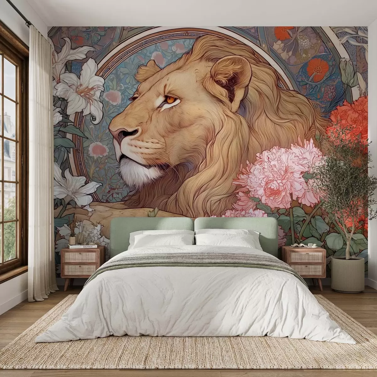 Fototapeta Lew otoczony wieloma kwiatami w stylu Alfonsa Muchy Nr w09073
