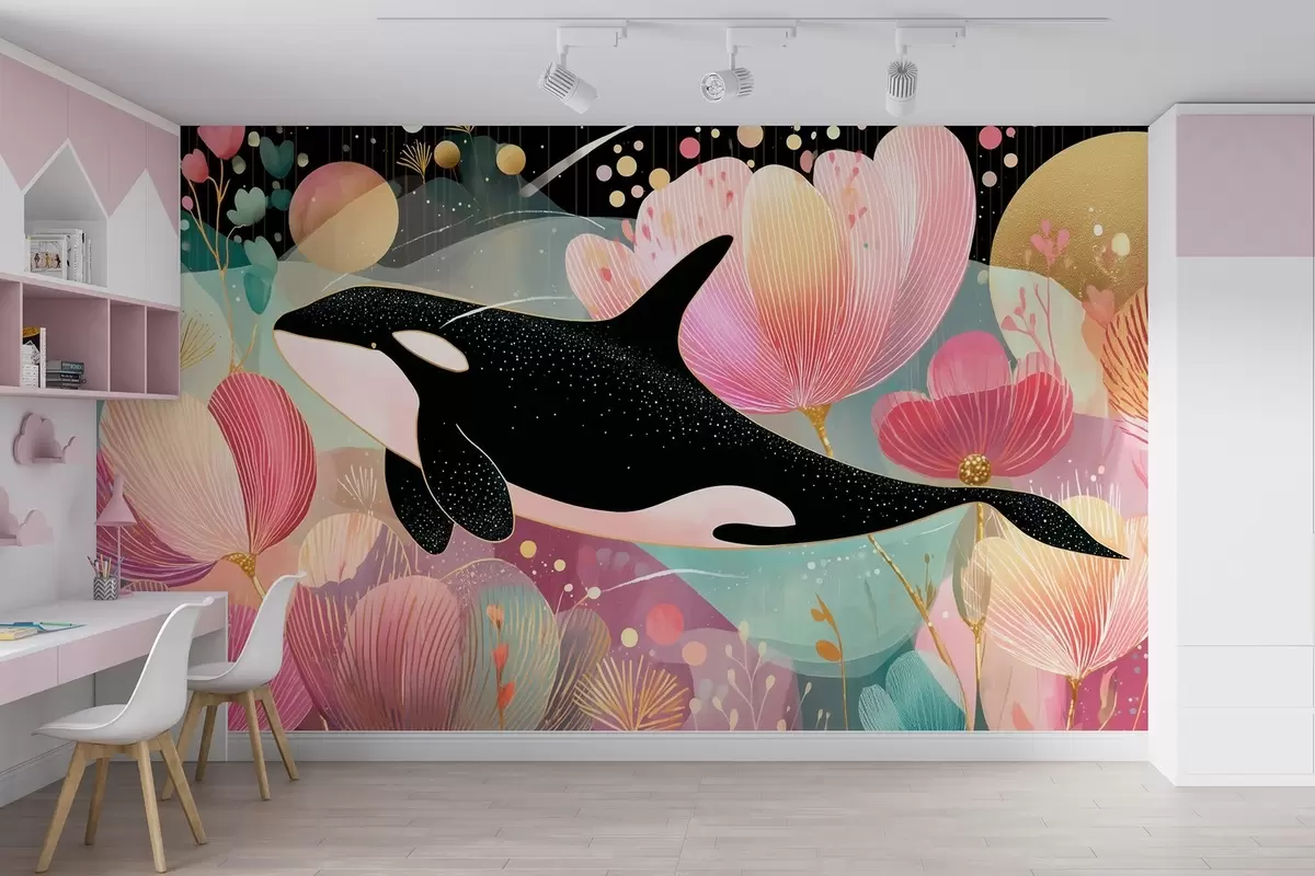 Fototapeta Pływająca czarna orka na tle różowych kwiatów Nr w09074
