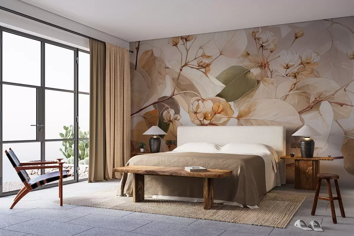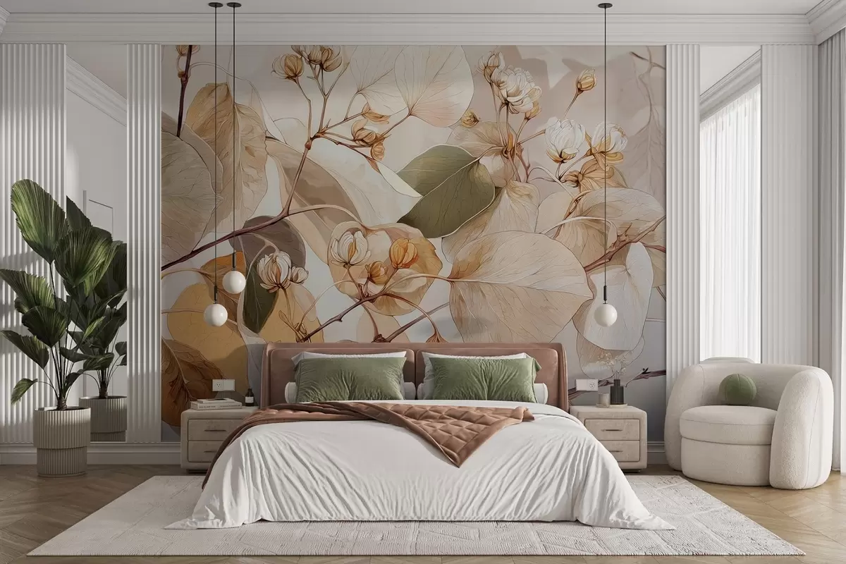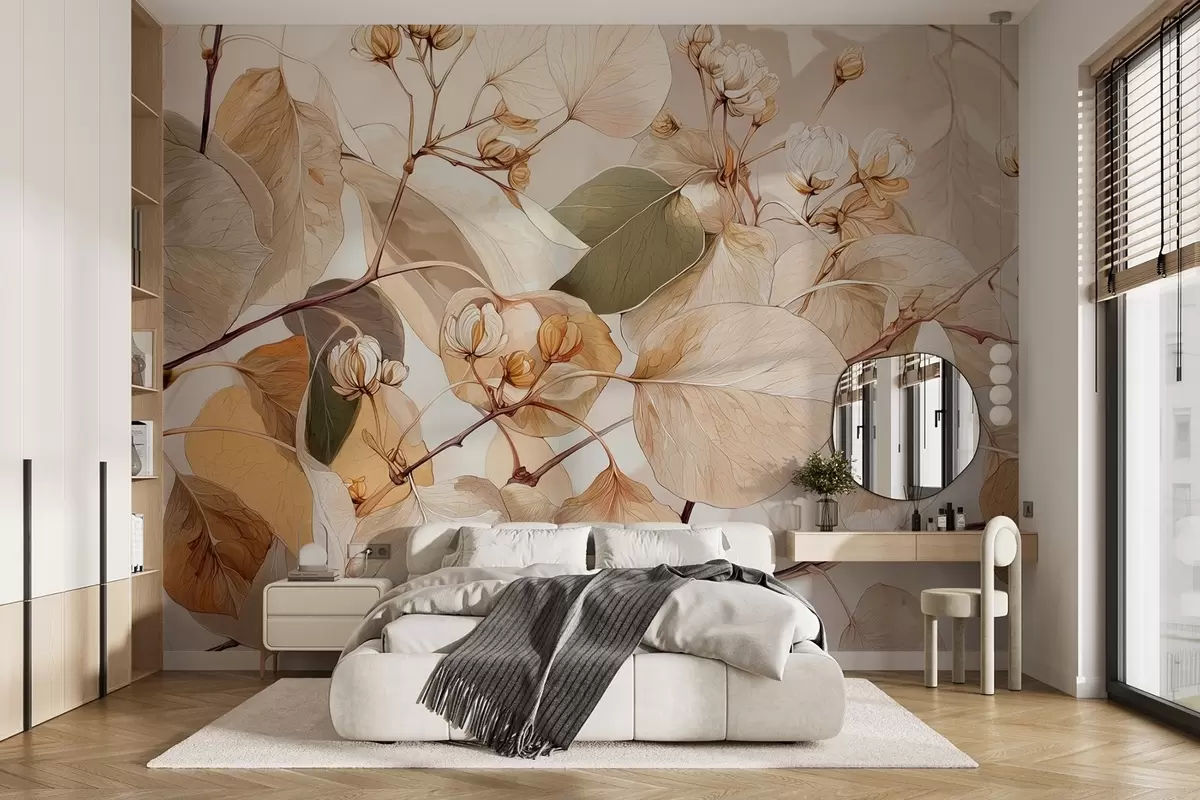 Fototapeta Gałęzie osiki z liśćmi i kwiatami w stylu malarstwa olejnego w odcieniach beżu Nr w09082