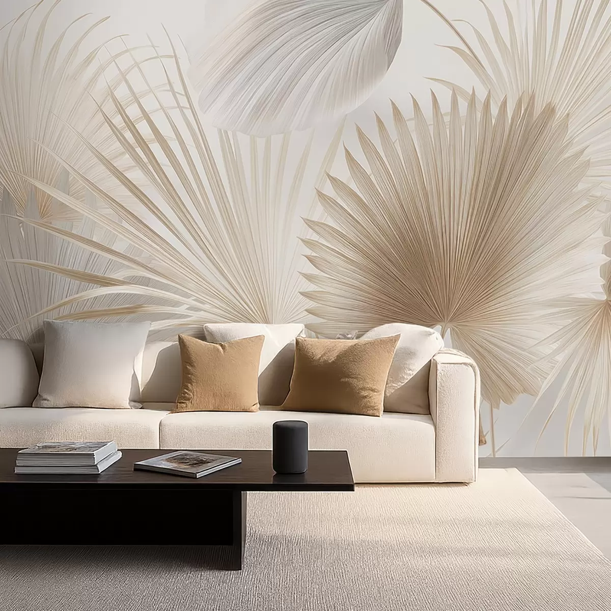 Fototapeta Miękkie wachlarze z liści tropikalnych w jasnobeżowych i niebieskawych odcieniach Nr w09084