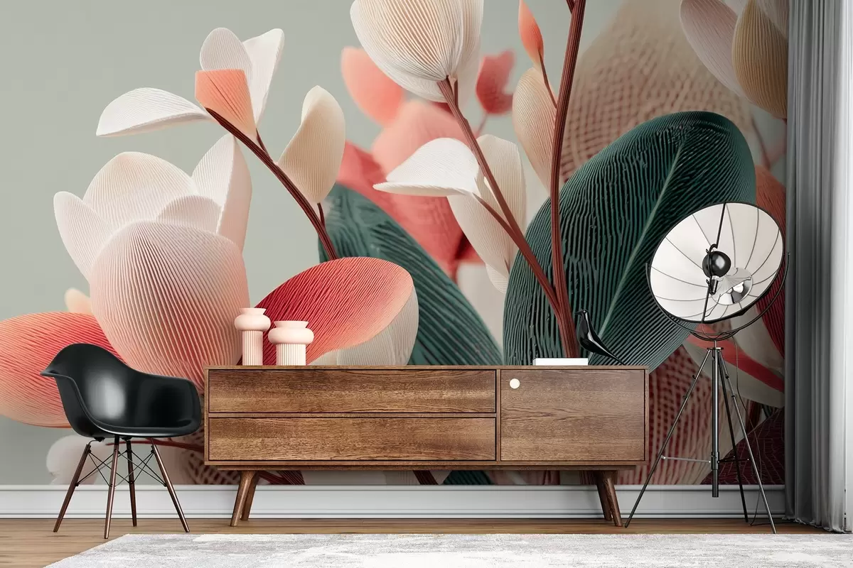 Fototapeta Teksturowane kwiaty i liście w pastelowych i zielonych odcieniach Nr w09094