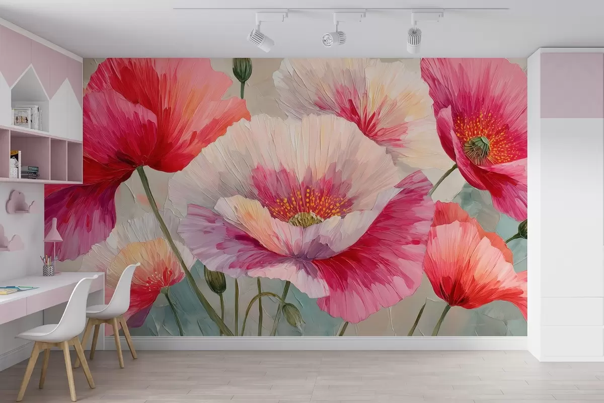 Fototapeta Białe i czerwone maki w stylu malarstwa olejnego z odważnymi pociągnięciami pędzla Nr w09097