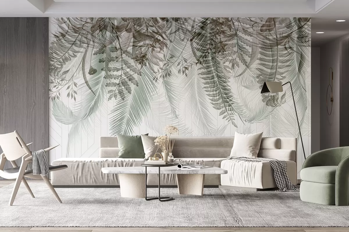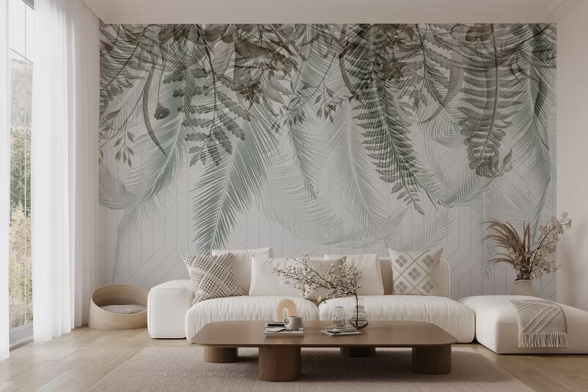 Fototapeta Delikatne opadające tropikalne liście paproci i palmy, geometryczne tło, miękkie światło, stonowane kolory, eleganckie Nr w09106v1