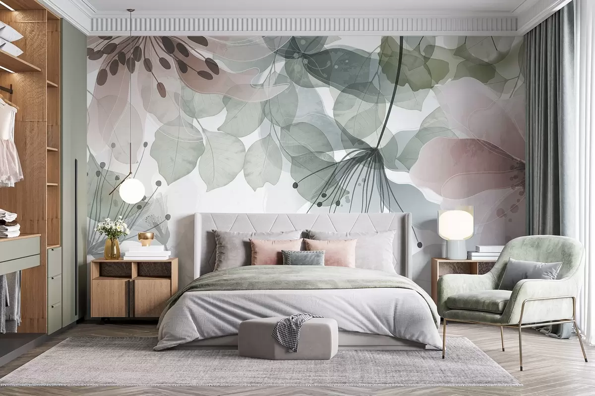 Fototapeta Kwiaty i liście w pastelowych kolorach, półprzezroczyste płatki i liście, miękki efekt akwareli, delikatne linie, białe tło Nr w09107
