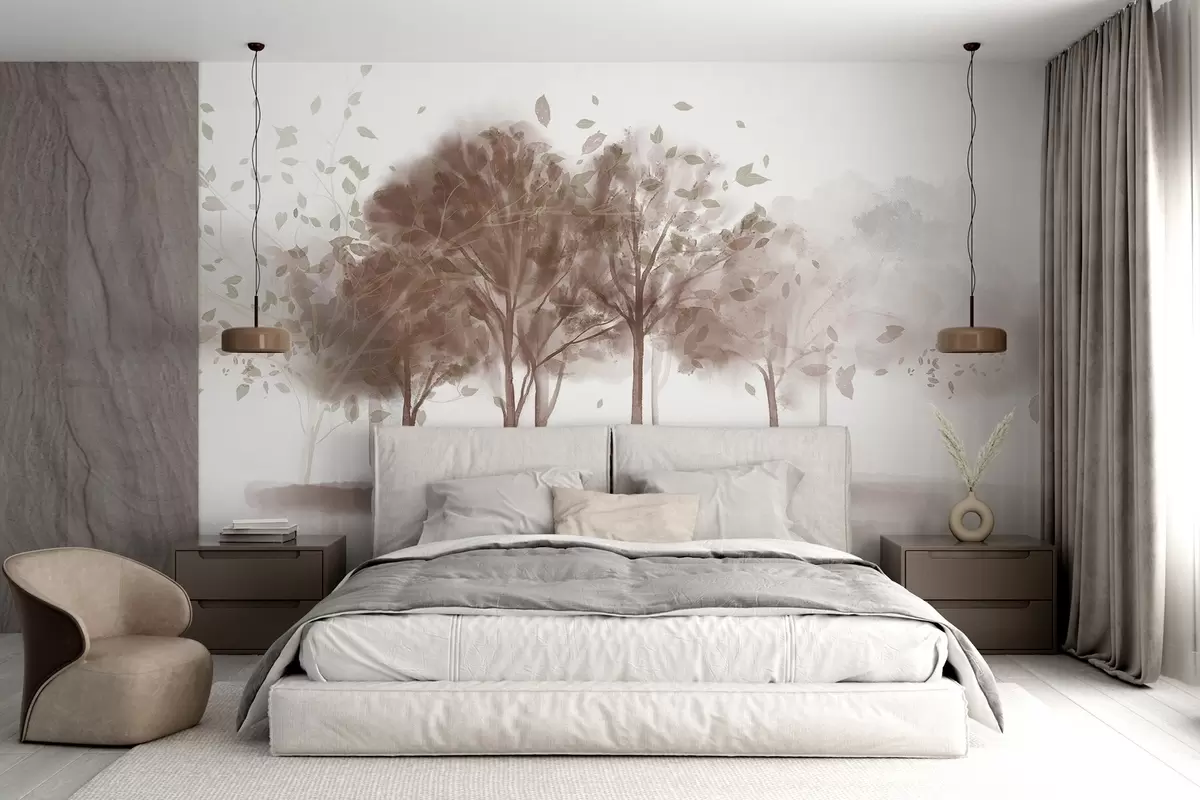 Fototapeta Abstrakcyjny krajobraz z drzewami o brązowych liściach odbijających się w wodzie, w stylu akwareli z teksturą Nr w09109v1