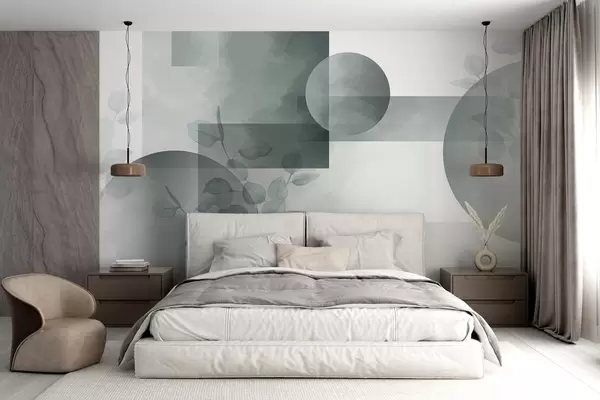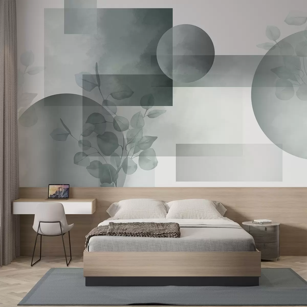 Fototapeta Abstrakcyjny nowoczesny minimalistyczny geometryczny wzór z okręgami i prostokątami, liście eukaliptusa, efekt akwareli Nr w09110