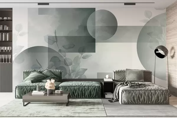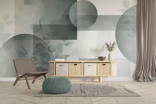 Fototapeta Abstrakcyjny nowoczesny minimalistyczny geometryczny wzór z okręgami i prostokątami, liście eukaliptusa, efekt akwareli Nr w09110