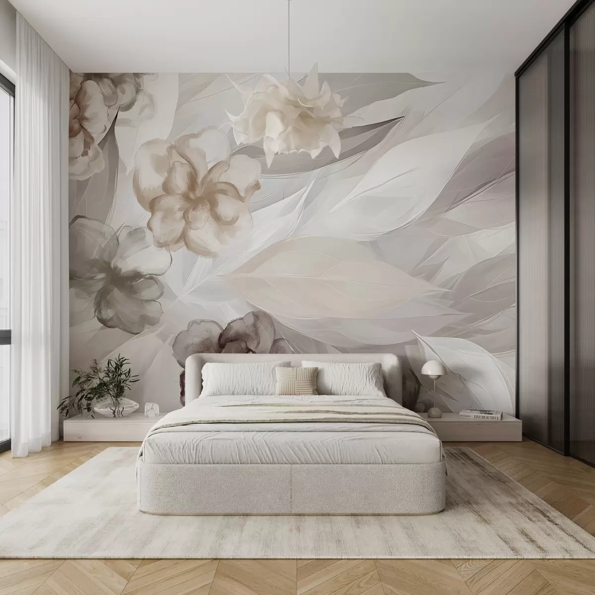 Fototapeta Delikatne kwiaty i liście w odcieniach bieli, brązu i beżu, kwiatowe tło, miękkie kolory, delikatne płatki Nr w09111v1