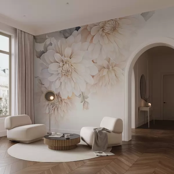 Fototapeta Pastelowe dalie z miękkimi, delikatnymi brzoskwiniowymi i białymi jasnymi płatkami w stylu akwareli, miękkie tło Nr w09115