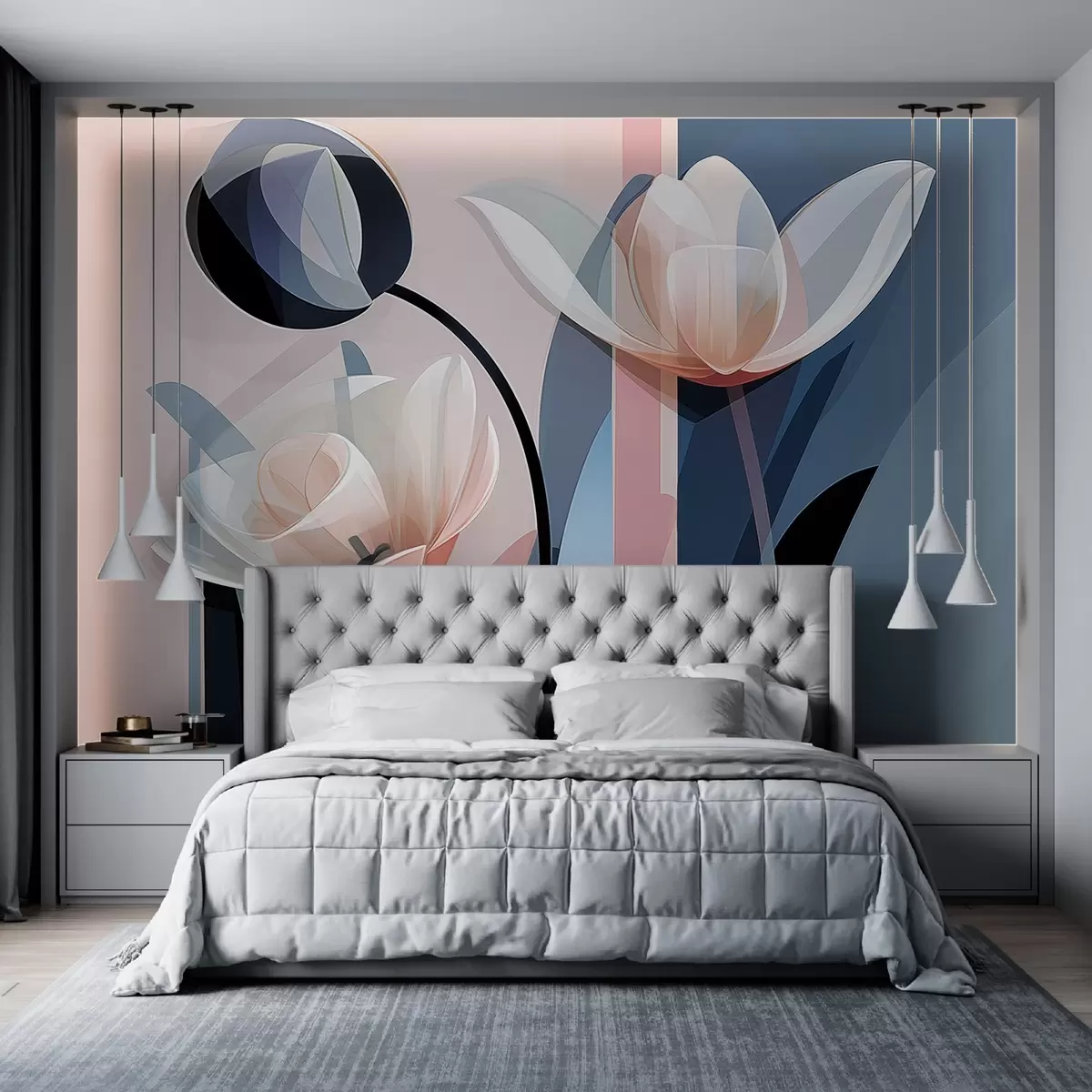Fototapeta Abstrakcyjny, nowoczesny wzór z tulipanami o przezroczystych płatkach w pastelowych odcieniach różu, bieli i ciemnoniebieskiego Nr w09116