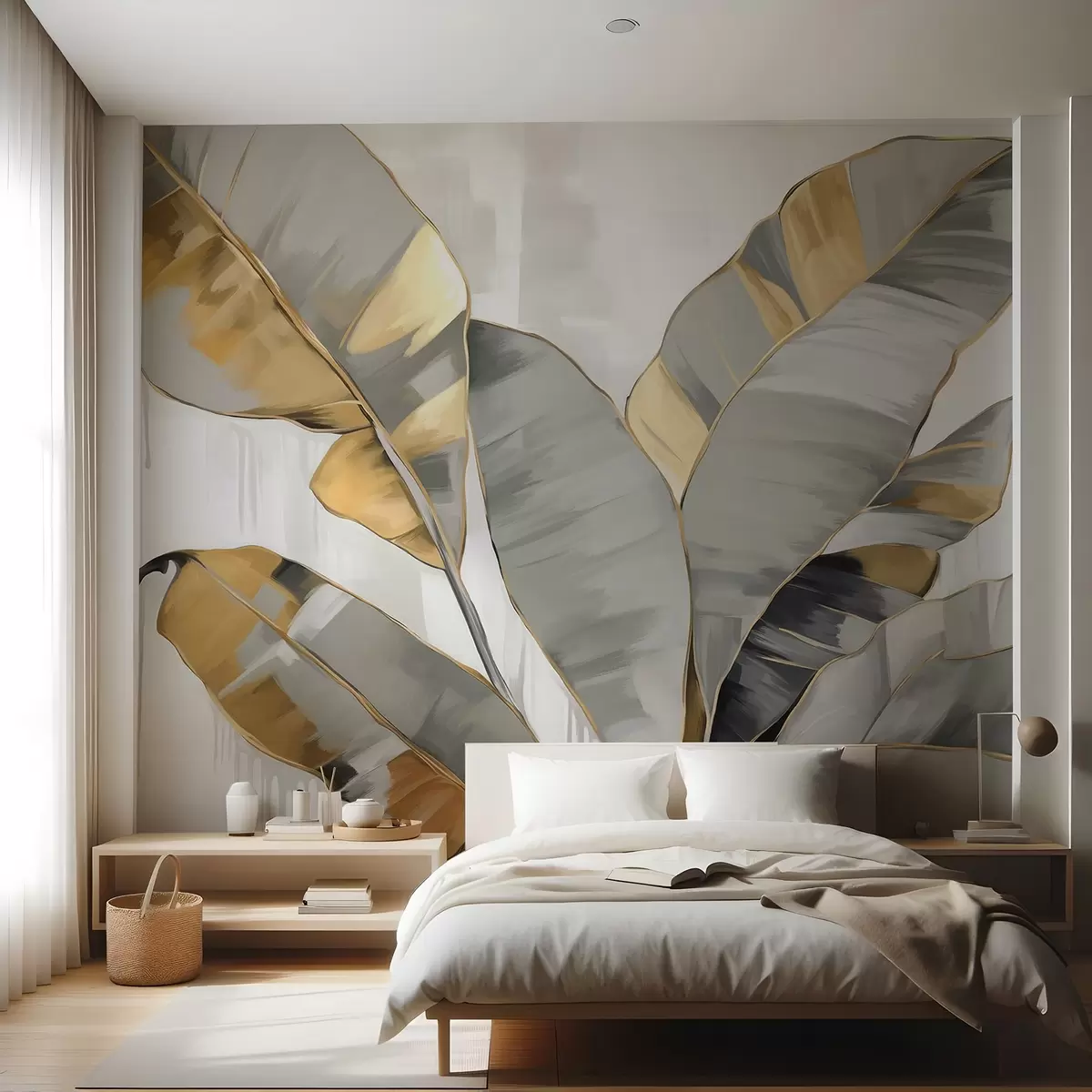 Fototapeta Banan tropikalne teksturowane liście z szarymi i żółtymi odcieniami, nowoczesny styl, neutralne tło, obraz dekoracyjny Nr w09118