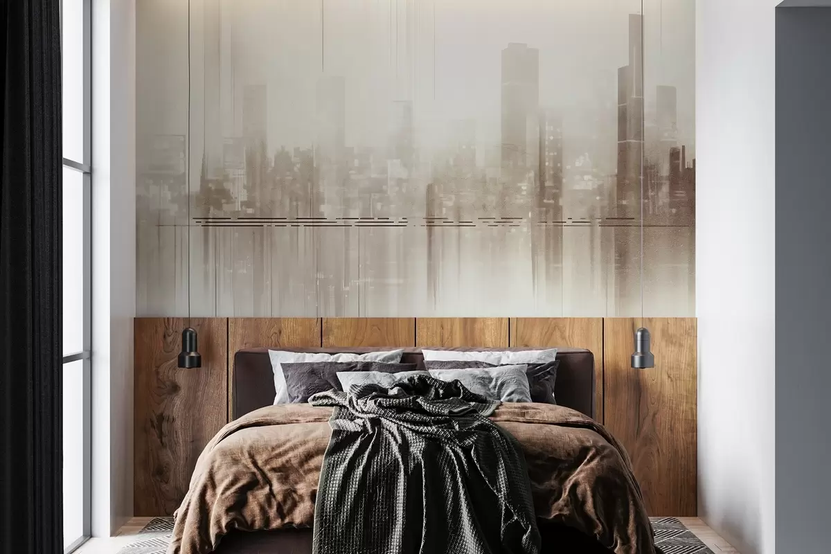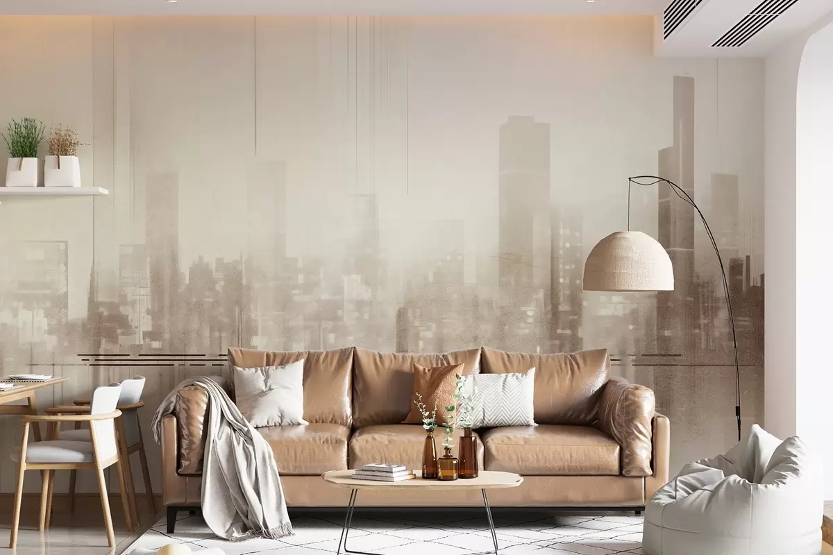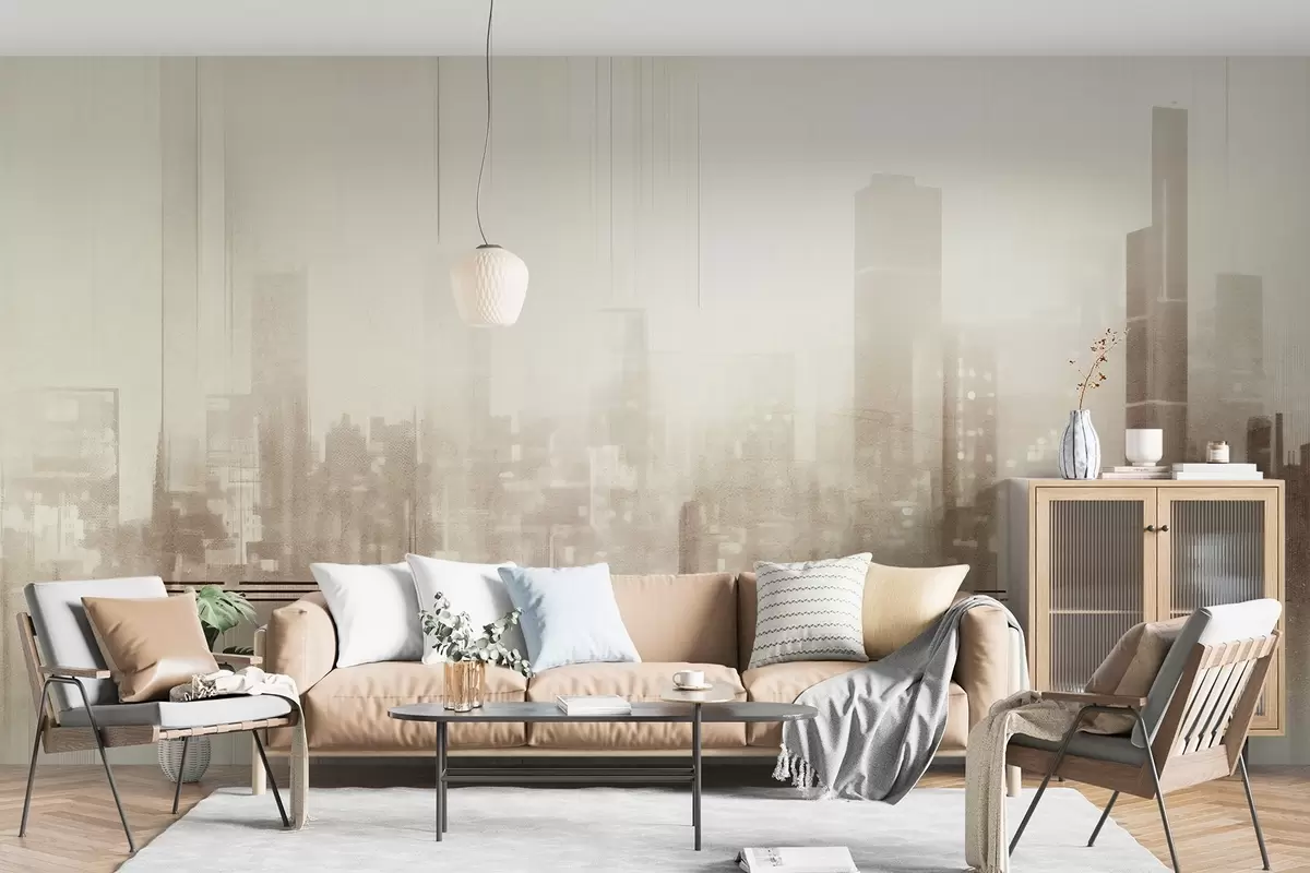 Fototapeta Abstrakcyjny teksturowany pejzaż miejski z wysokimi budynkami i pasami w odcieniach beżu i bieli, tworzący zamglony efekt Nr w09119v1