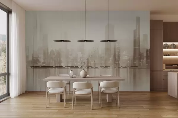 Fototapeta Abstrakcyjny teksturowany pejzaż miejski z wysokimi budynkami i pasami w odcieniach beżu i bieli, tworzący zamglony efekt Nr w09119v1
