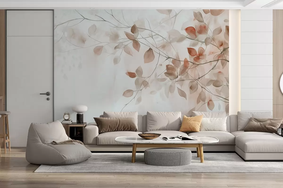 Fototapeta Teksturowy obraz akwarelowy imitujący brązowe liście i gałęzie, miękkie kolory, delikatne detale na białym tle Nr w09133